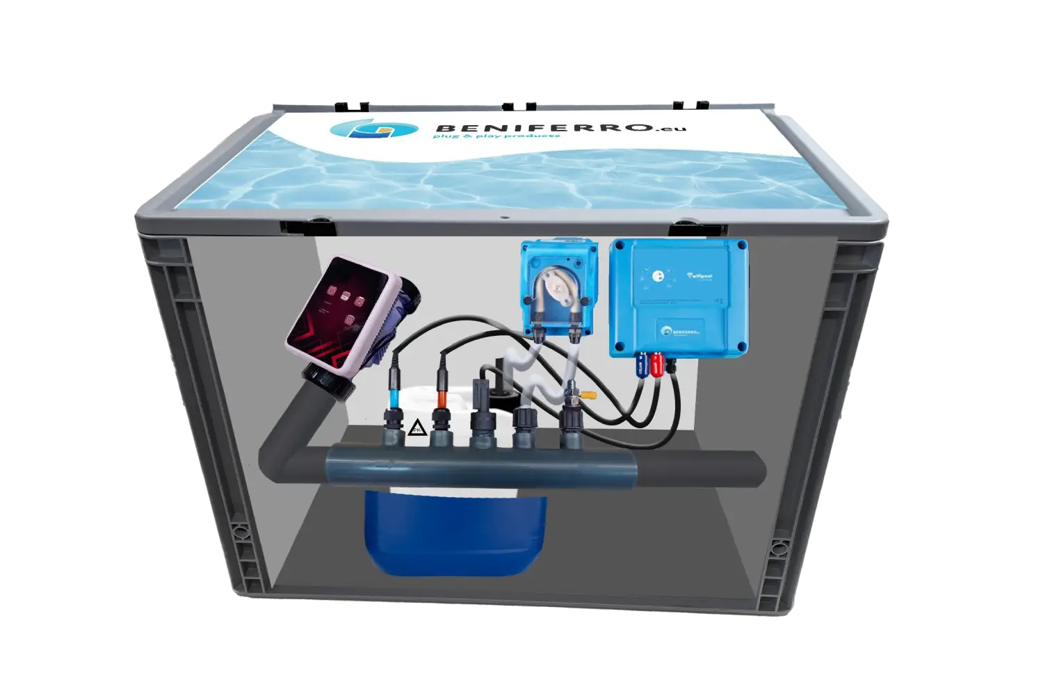 Sobald das Wasser durch den Mess-/Dosiernippel fließt, misst die Ausrüstung pH und Redox (Chlor) und passt die Poolwerte automatisch an. Bei korrekter Verwendung sind Sie zu 100% sicher für klares und gesundes Wasser.